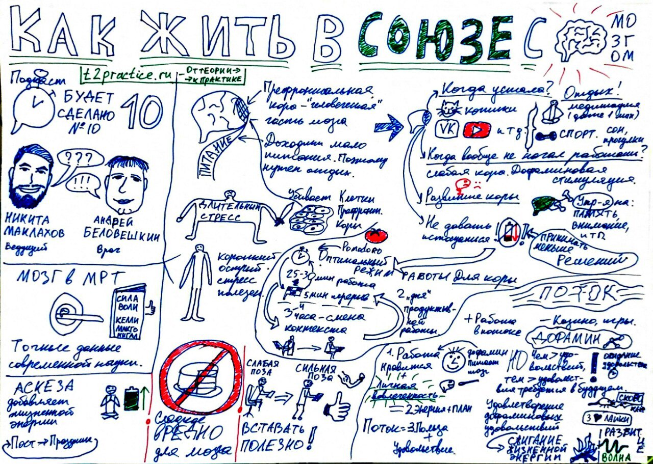 Хороший повод для радости есть у меня сегодня — первый настоящий скетчноут сделанный мной по беспрецедентно полезному подкасту Никиты Маклахова «Будет сделано» 10 выпуск — с приглашённым гостем Андреем Беловешкиным — врачом нейрофизиологом.